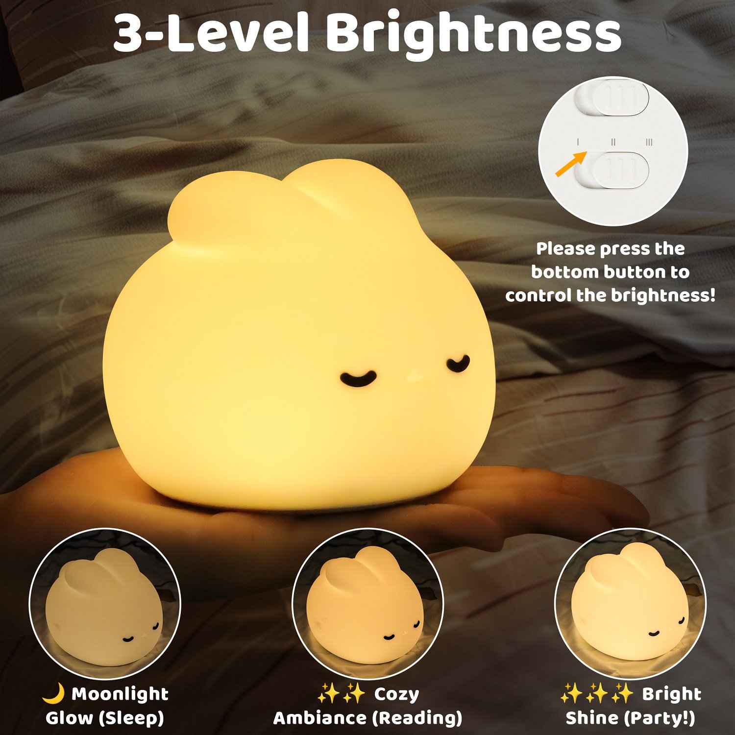 Simply tap/squeeze the bunny’s head to power on/off or adjust settings – effortless in darkness.