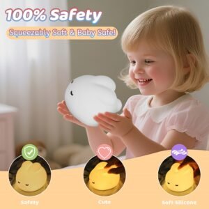 - 🐰【Baby-Safe Materials & Gentle Eye Protection】Crafted with BPA-free ABS and non-toxic silicone materials – naturally bite-resistant, free of sharp edges, and gentle against delicate skin. Features zero blue light emission with flicker-free 3000K warm yellow LEDs, designed to protect melatonin levels and comfort sensitive eyes during nighttime use.