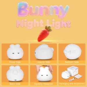 - 🐰【Ultra-Soft Squishy Design & Novel Experience】Sofe silicone creates a pinchable, stress-relieving bunny shape with a skin-friendly texture—doubling as a night light and sensory toy. Its warm glowing ambiance instantly adds playful charm to bedrooms, nurseries, or desks, serving as a comforting sleep companion.