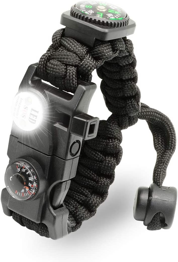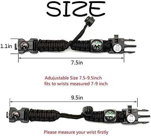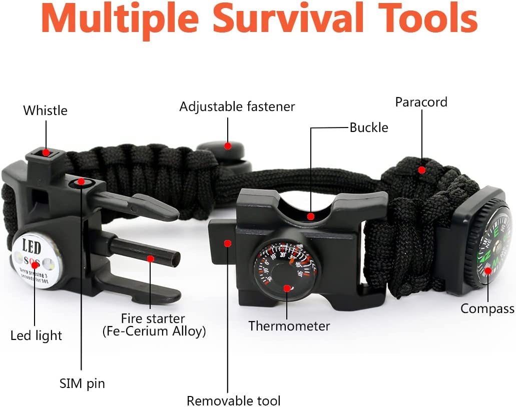 — 3.2 meter Parachute Cord with 7 core – The 113kg strength paracord multiltool bracelet can be unwound to be used for a variety of survival situations. Giving you better piece of mind when securing tents, hammocks, hanging heavy objects and much more!