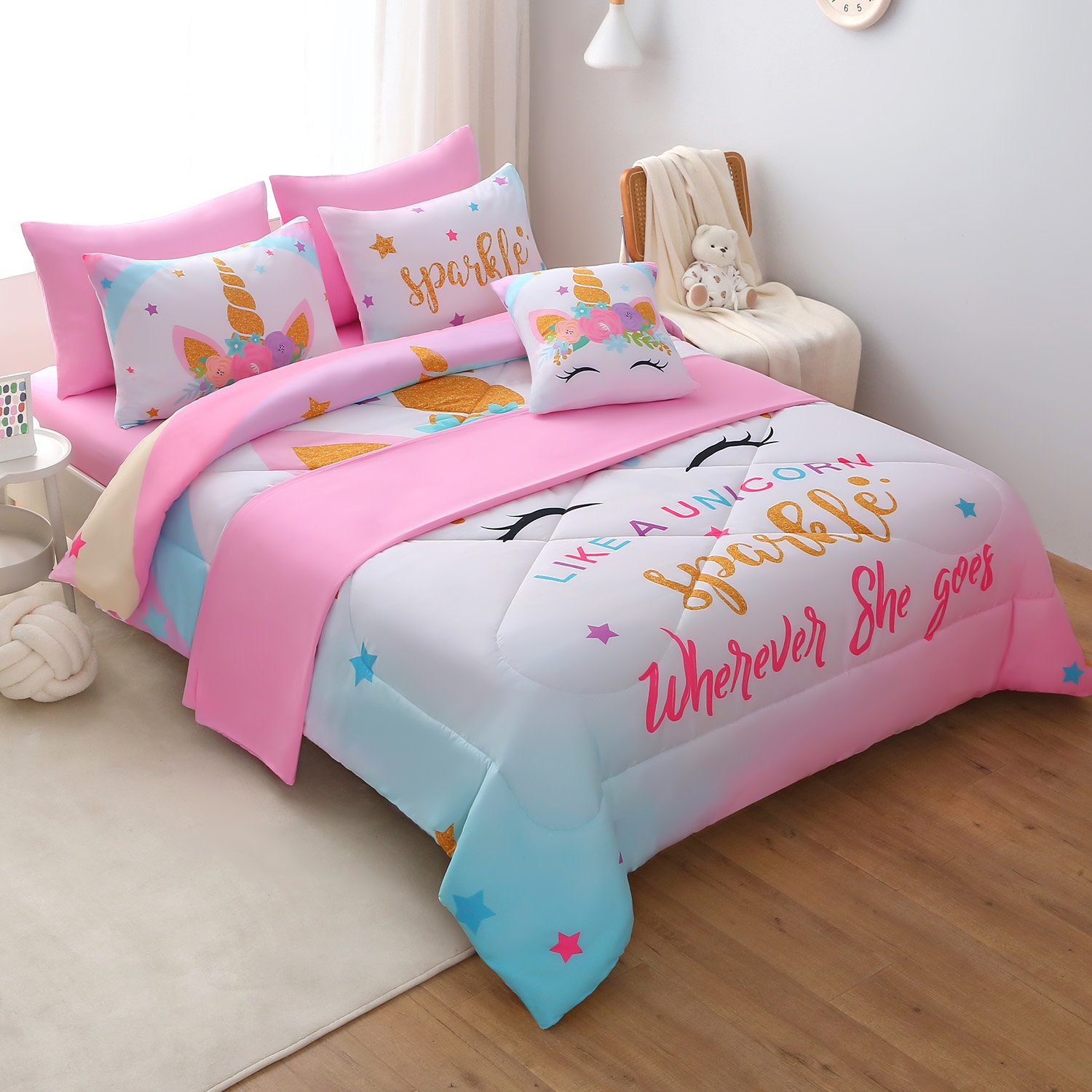 ❤【Complete Twin Size Set】: Our 6-piece Sparkle Unicorn Set includes everything needed for a cohesive theme (1 Comforter: 68″x90″, 1 Fitted Sheet: 39″x75″+14″, 1 Flat Sheet: 66″x96″, 2 Pillowcases(unicorn printed): 20″x27.5″, 1 Cushion Cover: 18″x18″). Instantly create a magical unicorn bedroom without extra decorations.